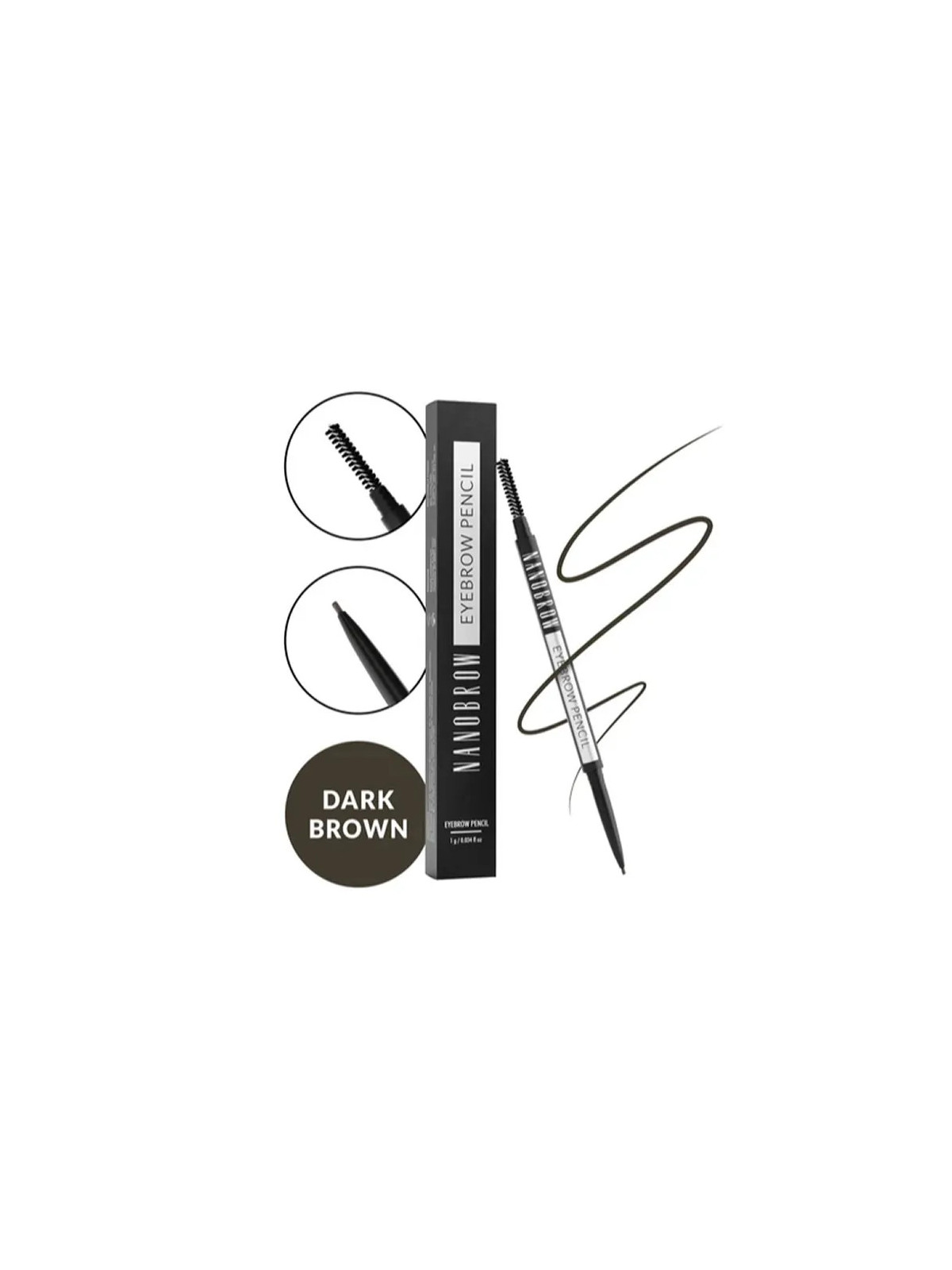 La pointe ultra-fine de ce crayon Nanobrow permet de dessiner trait par trait pour imiter les poils naturels. La teinte Dark Brown s'accorde idéalement aux cheveux châtains foncés à bruns.