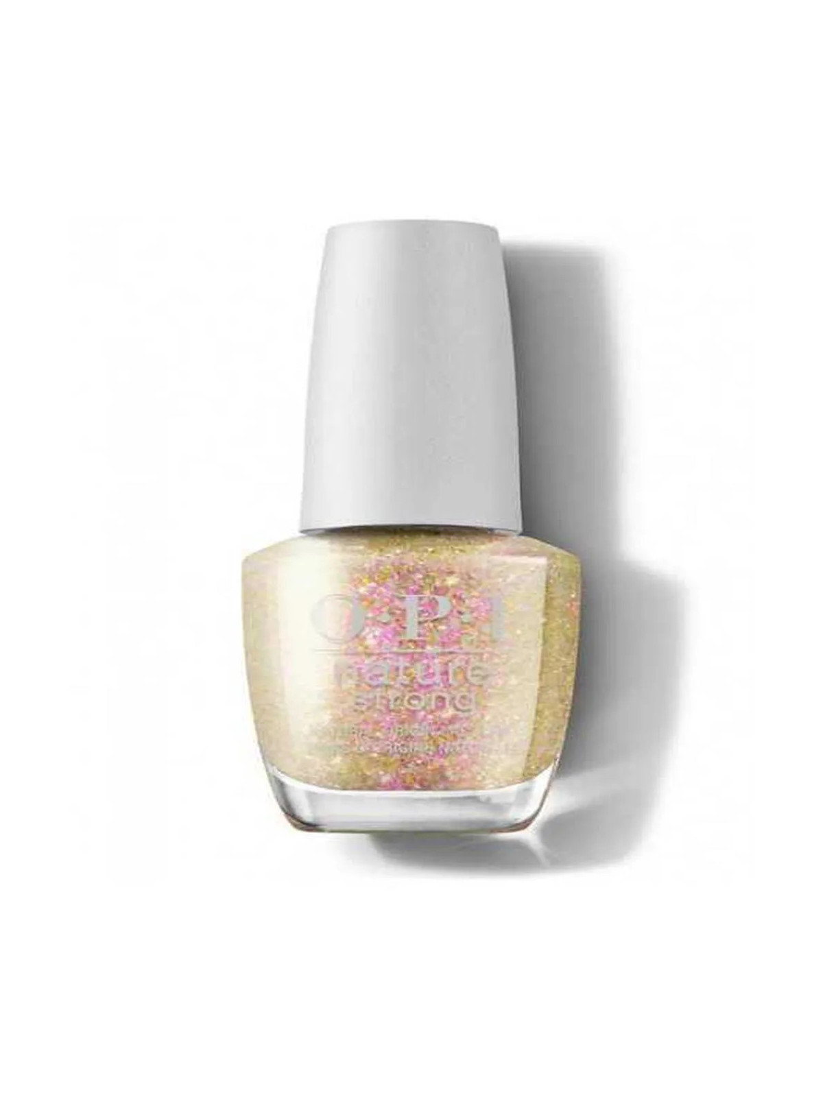 Vernis naturel OPI Nature Strong teinte or rose. Éclat métallisé d'origine végétale pour une manucure glamour et éco-responsable.
