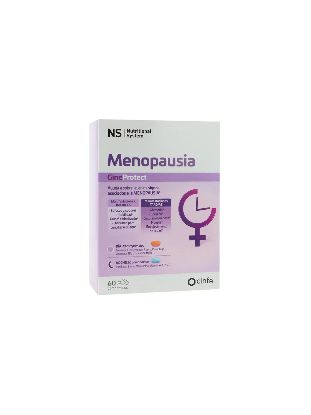 NS Ménopause Jour et Nuit est un complément alimentaire innovant avec une double formule adaptée aux besoins spécifiques de la femme ménopausée le jour et la nuit. Les laboratoires Cinfa ont conçu cette solution complète pour un confort optimal 24h/24.