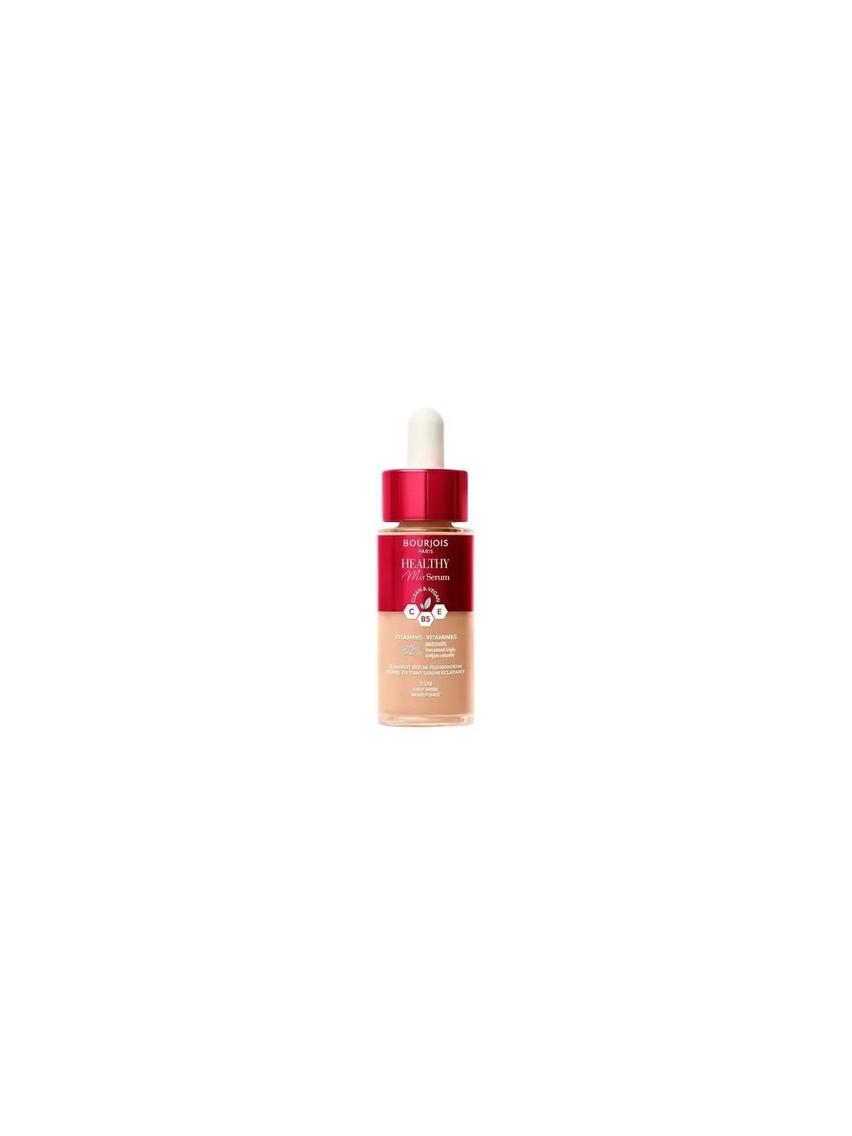 Le Healthy Mix Serum Foundation de Bourjois est un fond de teint innovant qui combine maquillage et soin de la peau. La teinte 55N-Deep Beige est adaptée aux peaux moyennes à mates aux sous-tons neutres.