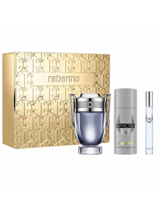 Ce coffret Paco Rabanne Invictus réunit l'Eau de Toilette 100ml et deux produits complémentaires pour une expérience olfactive complète. Un ensemble idéal pour les amateurs de cette fragrance masculine iconique ou pour offrir.