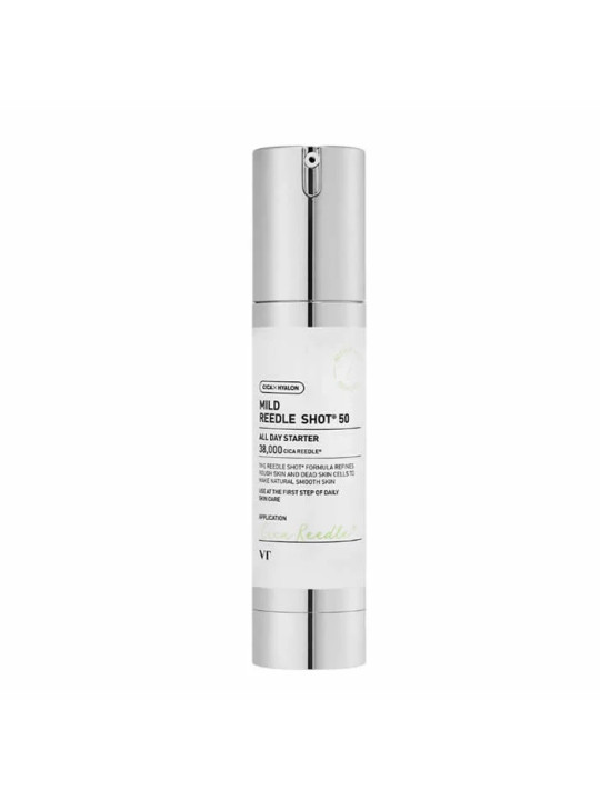 Le Mild Reedle Shot 50 de VT Cosmetics est la version la plus douce de la gamme Reedle Shot, spécialement formulée pour les peaux sensibles et les débutants en matière de soins aux micro-aiguilles. L'indice 50 garantit une concentration minimale pour une tolérance maximale.