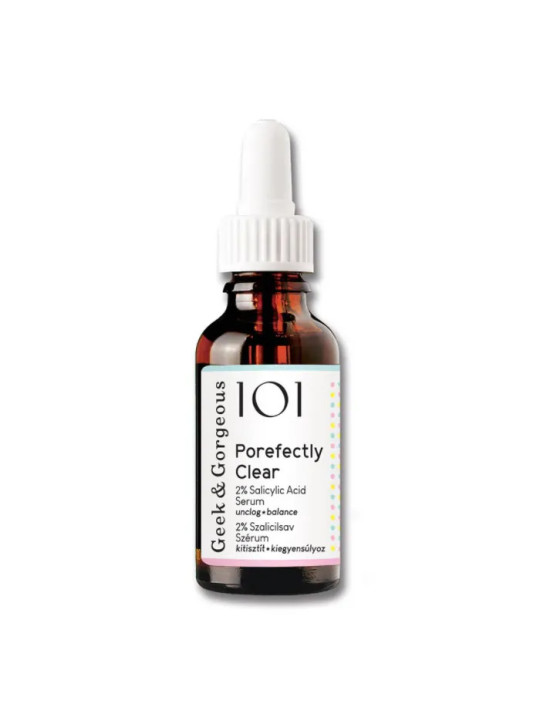 Porefectly Clear de Geek & Gorgeous est un sérum exfoliant concentré en acide salicylique (BHA) à 2%, spécialement formulé pour les peaux mixtes à grasses sujettes aux imperfections et aux pores dilatés. Cette marque hongroise propose des actifs puissants à des prix accessibles.