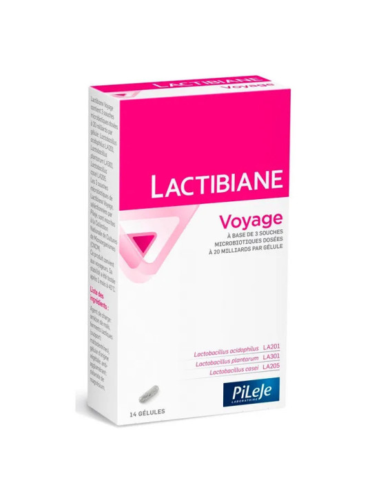 Pileje Lactibiane Voyage 14 Gélules est un complément alimentaire probiotique conçu pour accompagner les voyageurs et prévenir les troubles digestifs liés aux déplacements. Cette formule des laboratoires Pileje offre une protection ciblée pour les intestins en voyage.