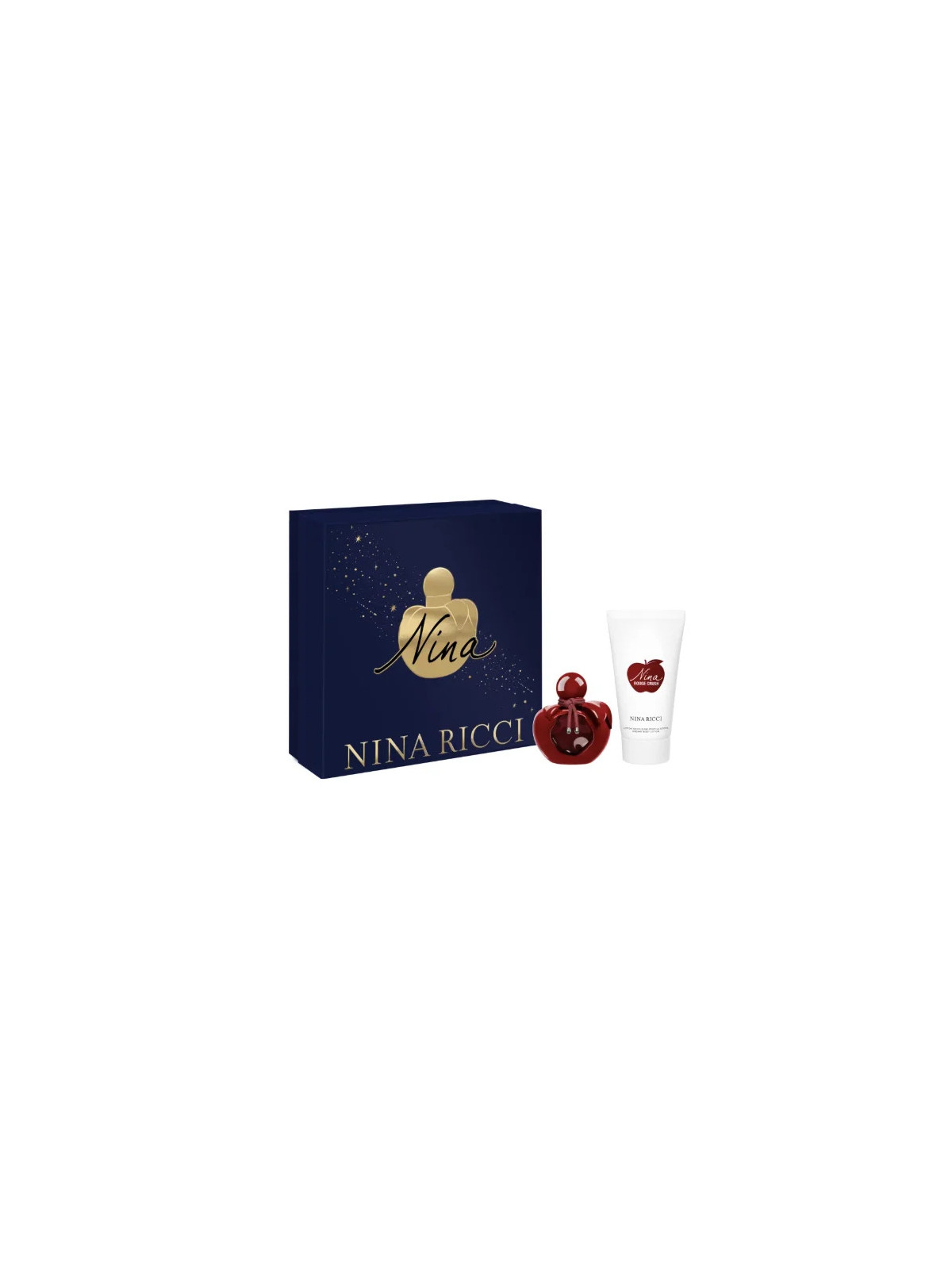Le flacon emblématique en forme de pomme, iconique de la collection Nina, se pare de la teinte rouge passion caractéristique de cette édition. Le produit complémentaire du coffret enrichit l'expérience olfactive et ajoute de la valeur à cet ensemble cadeau.