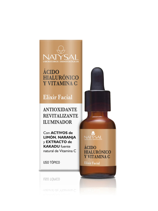 Natysal Acide Hyaluronique et Vitamine C Élixir Facial est un soin visage concentré formulé par le laboratoire Natysal, associant deux actifs cosmétiques phares : l'acide hyaluronique et la vitamine C. Ce duo d'exception offre hydratation intense et éclat lumineux à la peau.