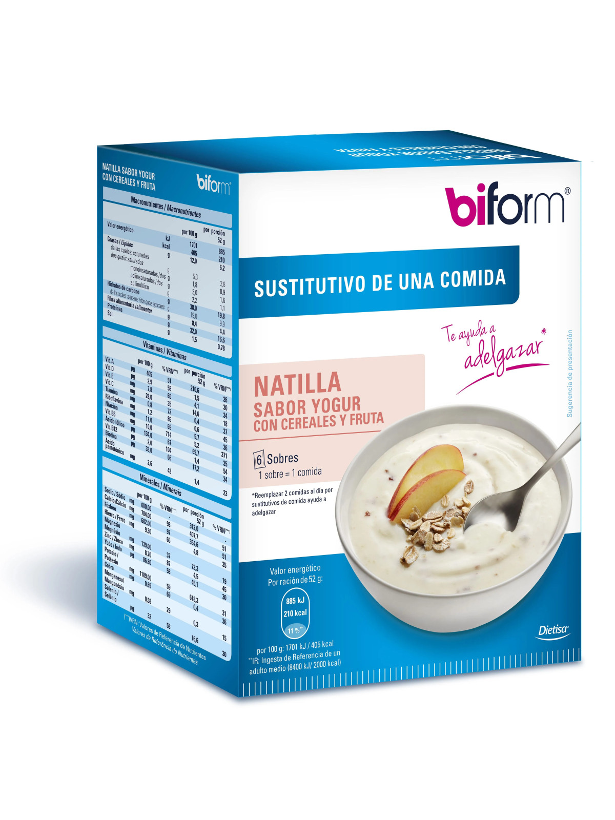 Les Natillas Yaourt Céréales de Biform sont des substituts de repas hyperprotéinés sous forme de crèmes dessert, saveur yaourt aux céréales. Présentés en boîte de 6 sachets individuels, ils s'inscrivent dans le cadre d'un programme de contrôle du poids.