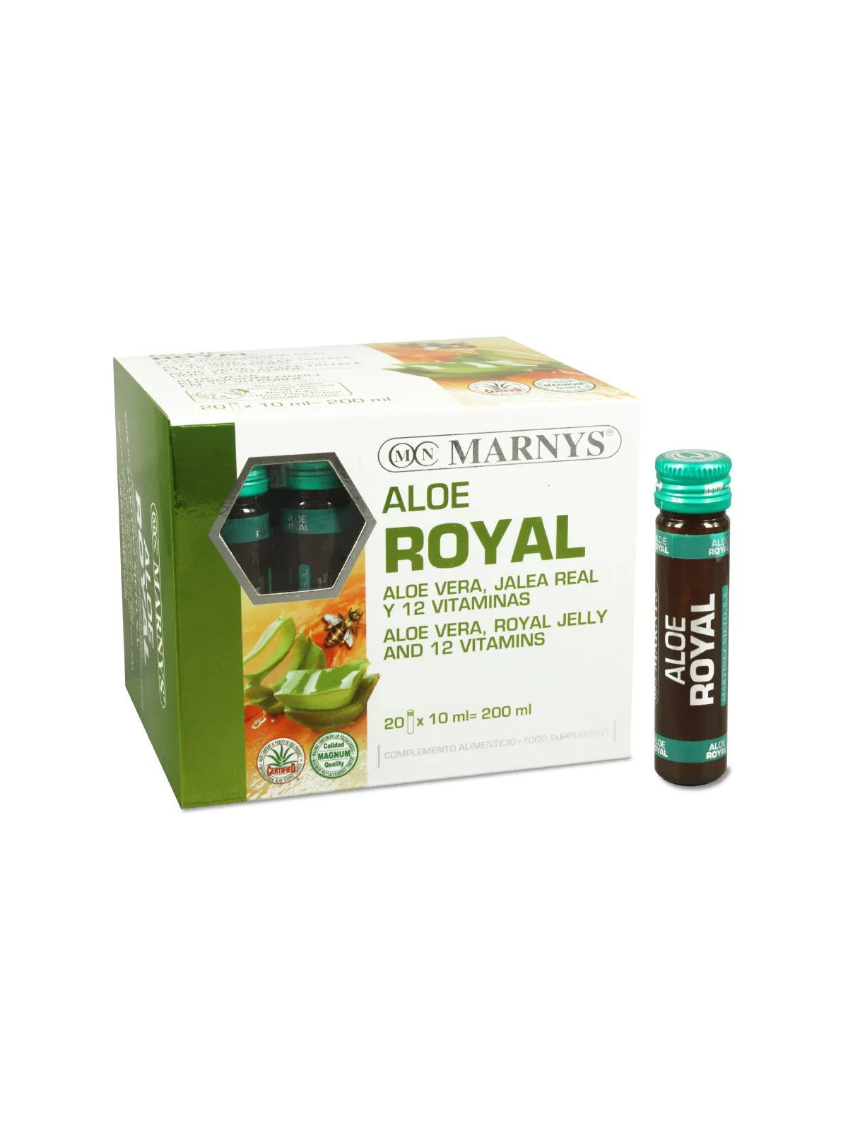 Marnys Aloe Royal est un complément alimentaire sous forme d'ampoules buvables associant l'aloe vera à la gelée royale. Marnys, laboratoire espagnol expert en produits naturels, propose cette formule synergique pour renforcer la vitalité et les défenses de l'organisme.