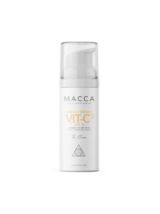 La crème Macca Absolut Radiant Vit-C3 SPF15 50ml est un soin visage haut de gamme qui combine les bienfaits antioxydants de la vitamine C avec une protection solaire SPF15 pour un teint éclatant et protégé au quotidien.