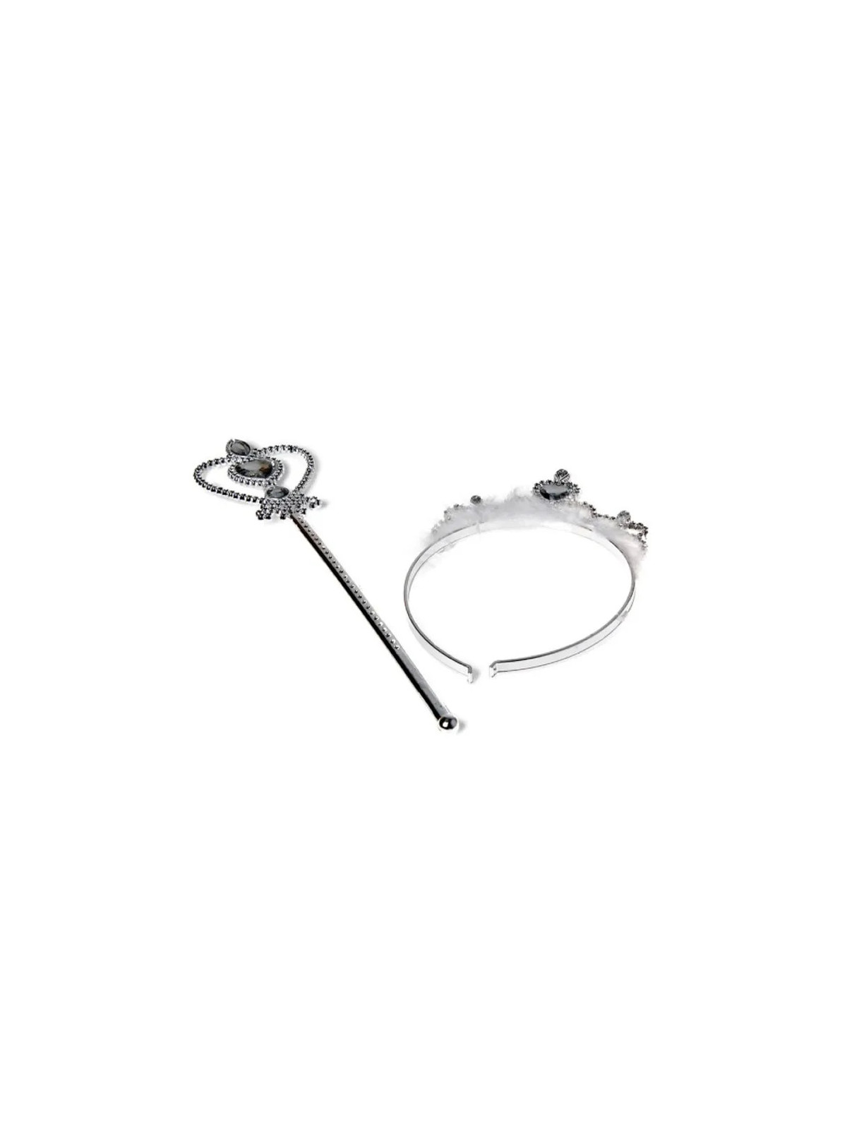 Cet ensemble comprend une couronne argentée scintillante et une baguette magique assortie, ornées de détails brillants qui captent la lumière. Les finitions soignées et les matériaux de qualité assurent un rendu élégant et féérique qui ravira les enfants.