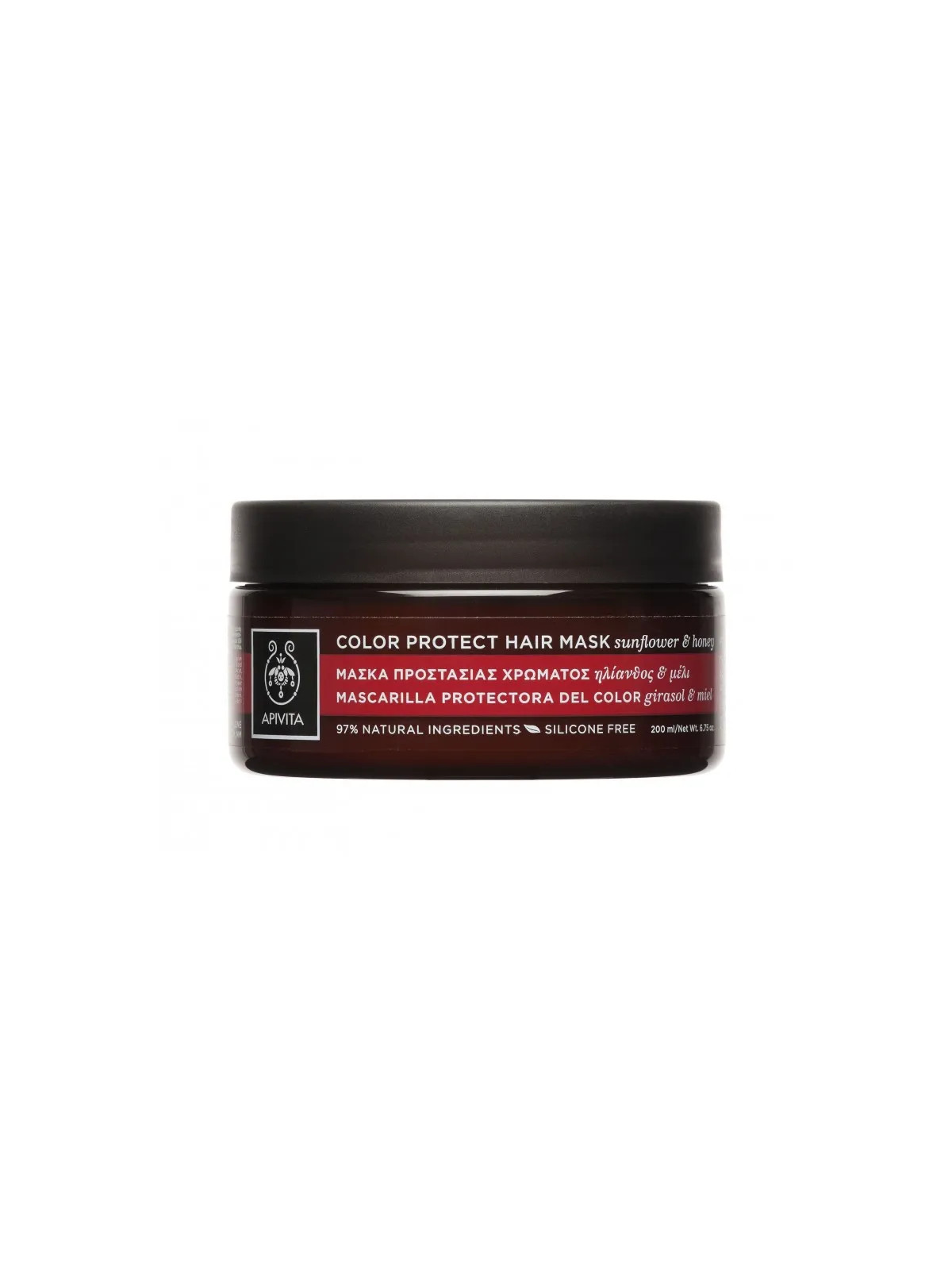 L'extrait de tournesol, riche en antioxydants, forme un bouclier protecteur autour de la fibre capillaire qui empêche la décoloration prématurée causée par les UV, les lavages répétés et les agressions extérieures. Le miel grec, ingrédient signature d'Apivita, apporte une hydratation intense et redonne brillance et souplesse aux cheveux.
