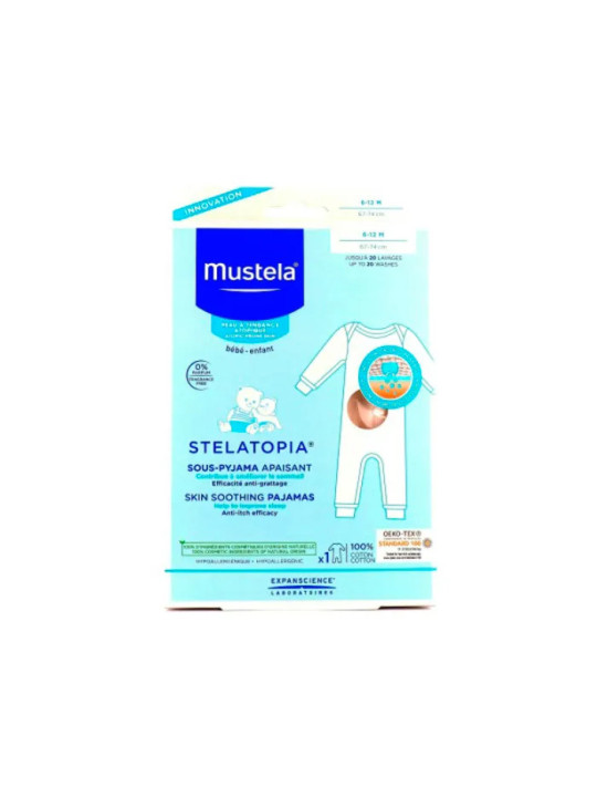 Taille 6-12 mois, ce pyjama complète la routine de soins Stelatopia. Il peut être lavé en machine à 40°C et conserve son efficacité pendant environ 70 lavages. Idéal en complément des crèmes émollientes pour une prise en charge globale de l'eczéma atopique.