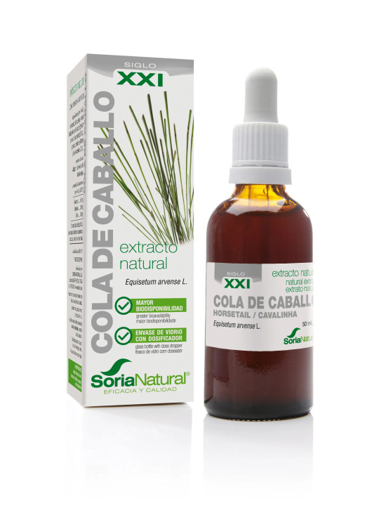Soria Extracto Cola de Caballo S XXI est un extrait fluide de prêle des champs (Equisetum arvense) développé par Soria Natural selon leur technologie exclusive S XXI. Cette méthode d'extraction permet d'obtenir un concentré hautement biodisponible des principes actifs de la plante.