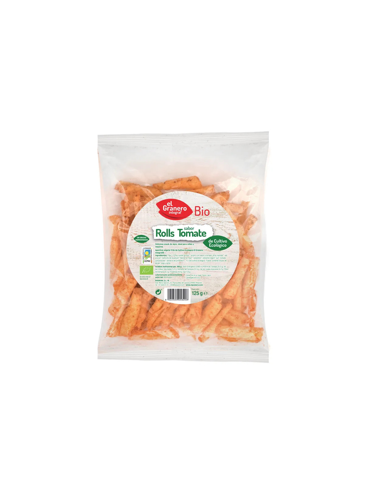 Granero Nachos Bioroll's à la Tomate Bio sont des chips de maïs aromatisées à la tomate, élaborées avec des ingrédients issus de l'agriculture biologique. Un encas festif et plus sain.